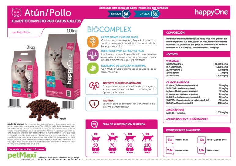 Proteína de ave deshidratada (25% de pollo), trigo, maíz, grasa de ave, harina de pescado (4% atún), gluten de maíz, sustancias minerales, hidrolizado de proteína de ave, pulpa de remolacha (2%), levaduras (fuente de MOS 500 mg/kg), Yucca schidigera (125 mg/kg).