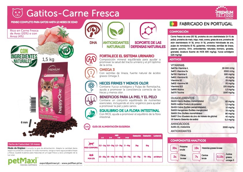 Carne fresca de aves (20 %), proteína de ave deshidratada (14 % de pollo), proteína de maíz, trigo, maíz, avena, grasa de ave, proteína de atún deshidratado (4 %), arroz (4 %), proteína hidrolizada de ave, pulpa de remolacha (2 %), guisantes, minerales, semillas de linaza, plasma porcino, DHA, antioxidantes naturales (romero, grosella, granada), levadura (fuente de MOS 500 mg/kg), Yuca schidigera (125 mg/kg).