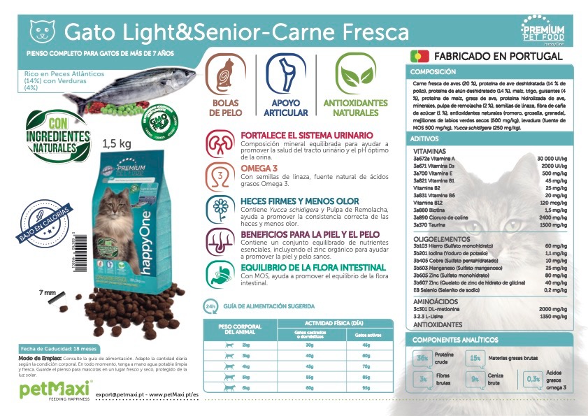 Carne fresca de aves (20 %), proteína de ave deshidratada (14 % de pollo), proteína de atún deshidratado (14 %), maíz, trigo, guisantes (4 %), proteína de maíz, grasa de ave, proteína hidrolizada de ave, minerales, pulpa de remolacha (2 %), semillas de linaza, fibra de caña de azúcar (1 %), antioxidantes naturales (romero, grosella, granada), mejillones de labios verdes secos (500 mg/kg), levadura (fuente de MOS 500 mg/kg), Yuca schidigera (250 mg/kg).